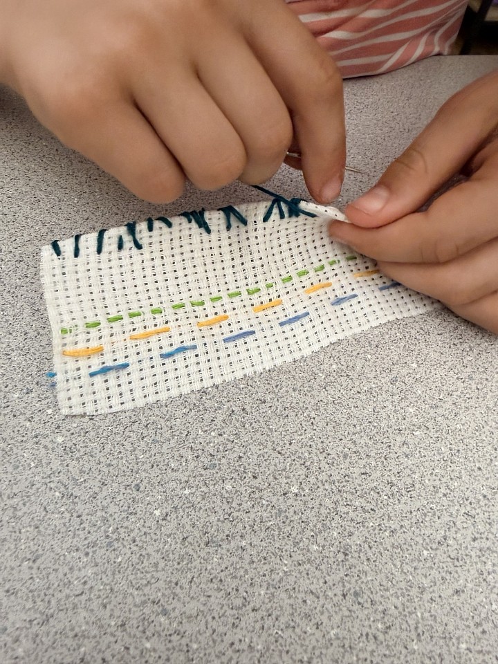 На очередном уроке в Творческой мастерской мы отработали основные швы, которые понадобятся нам при создании мягкой игрушки: «вперёд иголку», «назад иголку», обмёточный и петельный. Это задание — гораздо больше, чем просто запомнить последовательность движений. Монотонные, повторяющиеся действия руками развивают внимание и усидчивость, вырабатывают привычку доводить начатое до конца и дарят особое спокойствие — ведь ритм стежков действует как медитация. Каждый наш творческий проект не только красив, но и полезен. Образец швов, выполненный на канве, превращается в аккуратную закладку для книг.